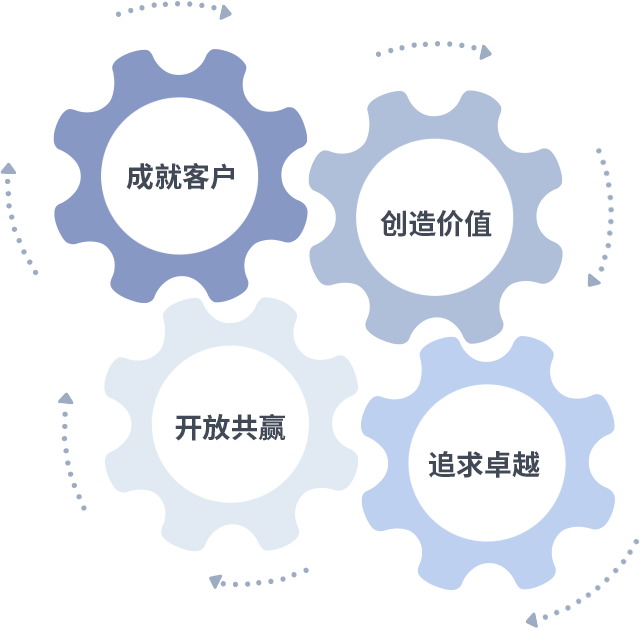成就客户是一切决策的出发点,创造价值是衡量所有工作的标准,追求卓越是龙8国际做事做人的态度,开放共赢是龙8国际的格局也是最终的结果。价值观的齿轮环环相扣,推动着组织里的每个人不断向前。
